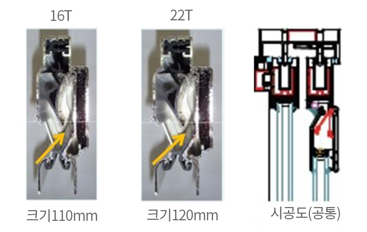 -BK산업 제품은 유리 홈 분리 기술로 유리두께에 상관없이 환기창을 시공하며 크기가 동일 -타사제품은 구조체 크기가 달라서 유리발주를 잘못하는 경우가 종종 발생함 |